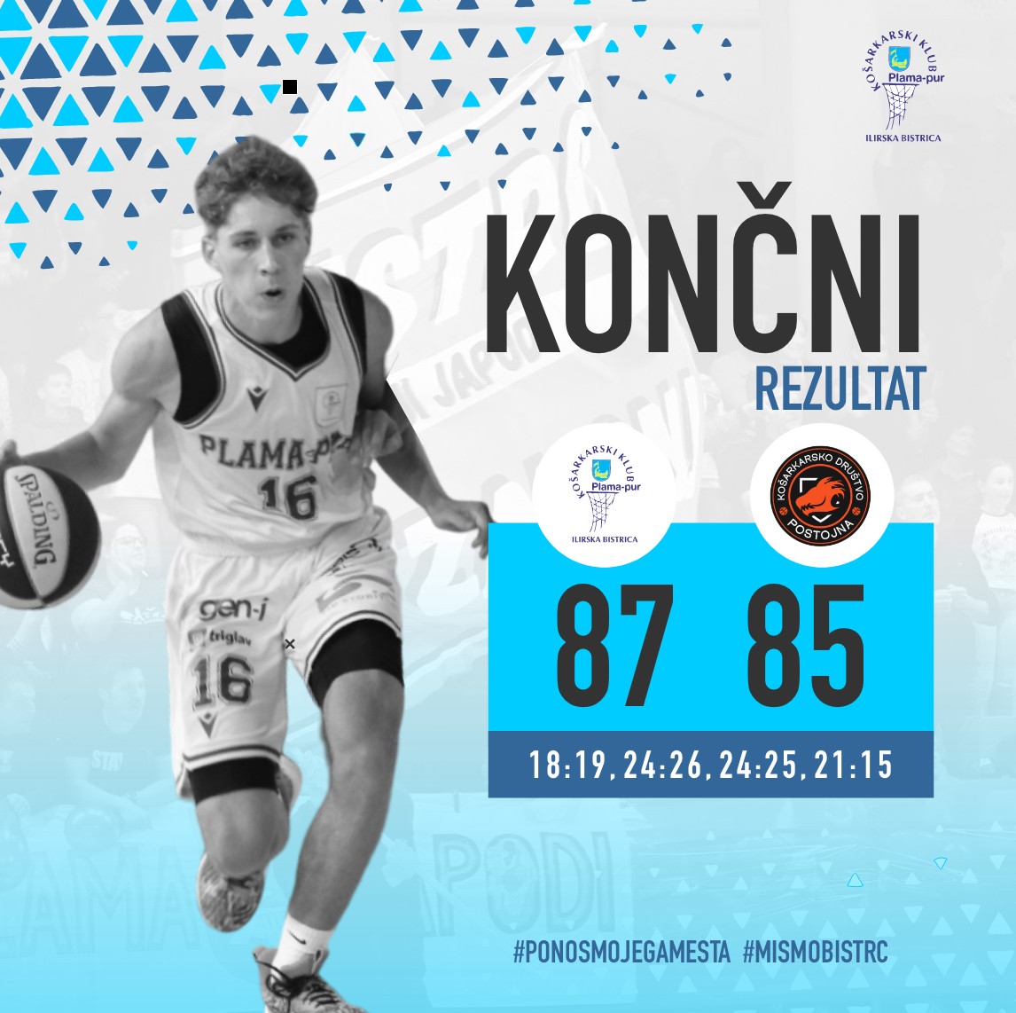 Člani / Plama pur – Postojna 87:85 Tekme 15 marca, 2026 Člani 14.3.2026. Ilirska Bistrica KK Plama-pur – KD Postojna 87:85 (18:19, 24:26, 24:25, 21:15 ) deli: